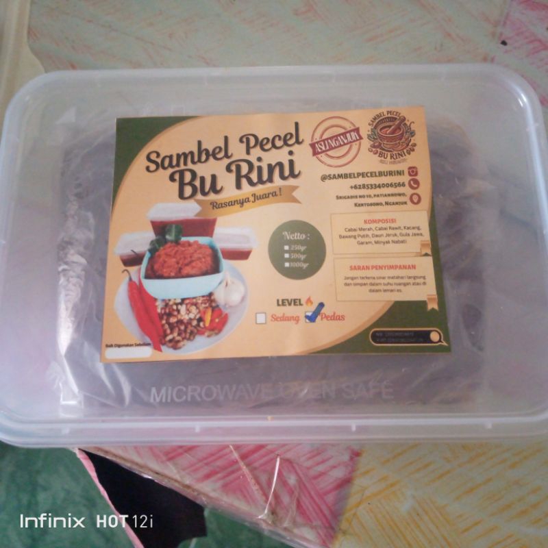 Sambal pecel dengan bahan bahan pilihan bisa request pedas ato sedang. Jadi rasa nya khas karena pilihan bahan bahan pilihan. bisa dipesan 250 gram,500gram,1000gram