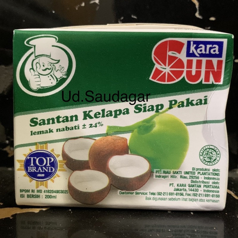 Sun Kara merupakan santan kelapa siap pakai yang terbuat dari air kelapa yang dikukur Santan Kara Sun diolah dan dikemas secara modern dan higienis menggunakan sterilisasi tinggi UHT sehingga kesegaran dan keaslian santan terjaga dengan baik serta membuatnya tahan disimpan dalam waktu lama di dalam kulkas