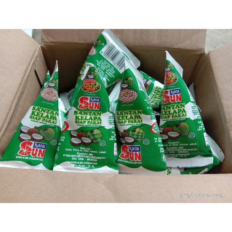 Sunkara santan 65ml ini ada 2 versi kemasan. sama-sama bentuk segitiga, hanya berbeda sedikit.