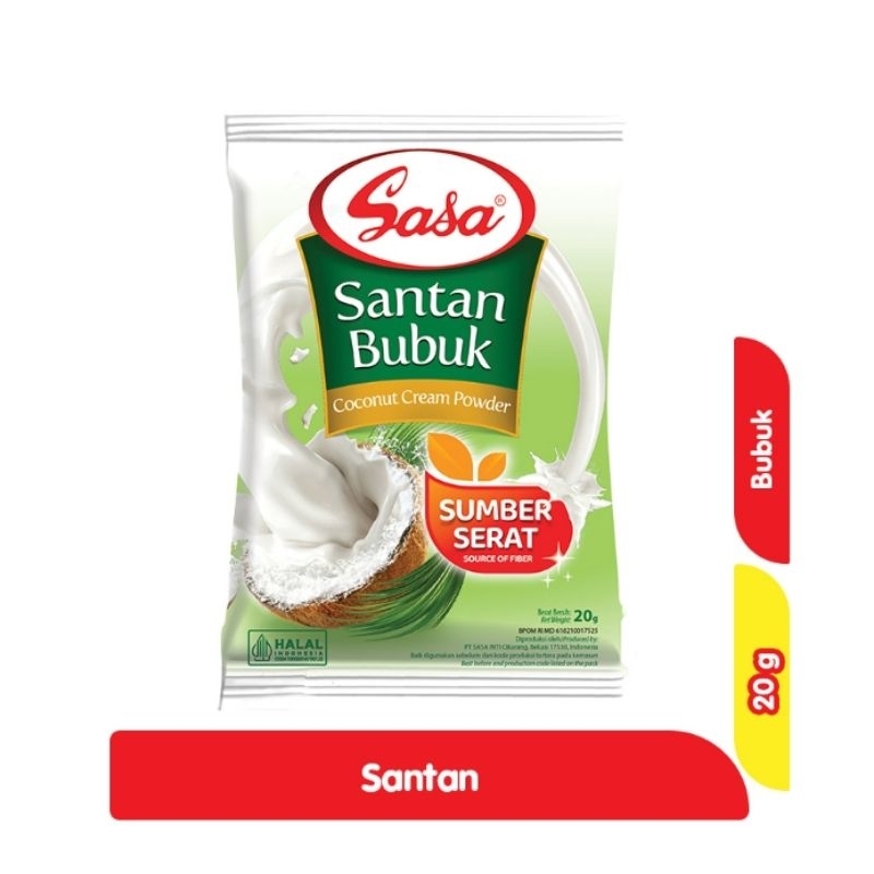 Sasa santan 20g adalah santan dalam bentuk bubuk dan tidak mengandung kolesterol. Sasa santan bubuk ini dapat tahan lebih lama dibanding santan cair. Mudah,praktis, higienis untuk melengkapi citarasa masakan anda di rumah.