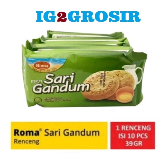 Biskuit Roma Sari Gandum Renceng 39 Gram - ( HARGA 1 RENCENG ISI 10 SACHET ) Roma Sari Gandum merupakan biskuit yang terbuat dari gandum pilihan. Biskuit ini juga mengandung susu bergizi, membuatnya lezat dan sehat. Nikmati biskuit bersama teh di sore hari dapat mencerahkan hari Anda.