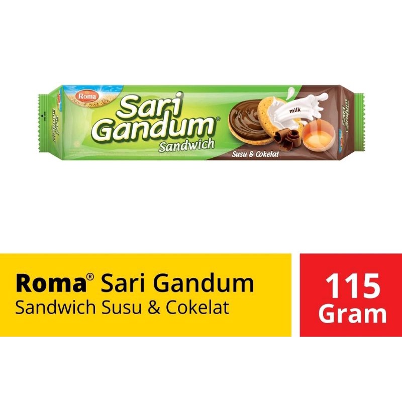 sari gandum demgan biskuit gandum sandwich dengan susu dan isian cream coklat & peanut yg memgandung vitamin B1, B2, B6 dan B12, cocok dan nikmat untuk menemani waktu senggangmu