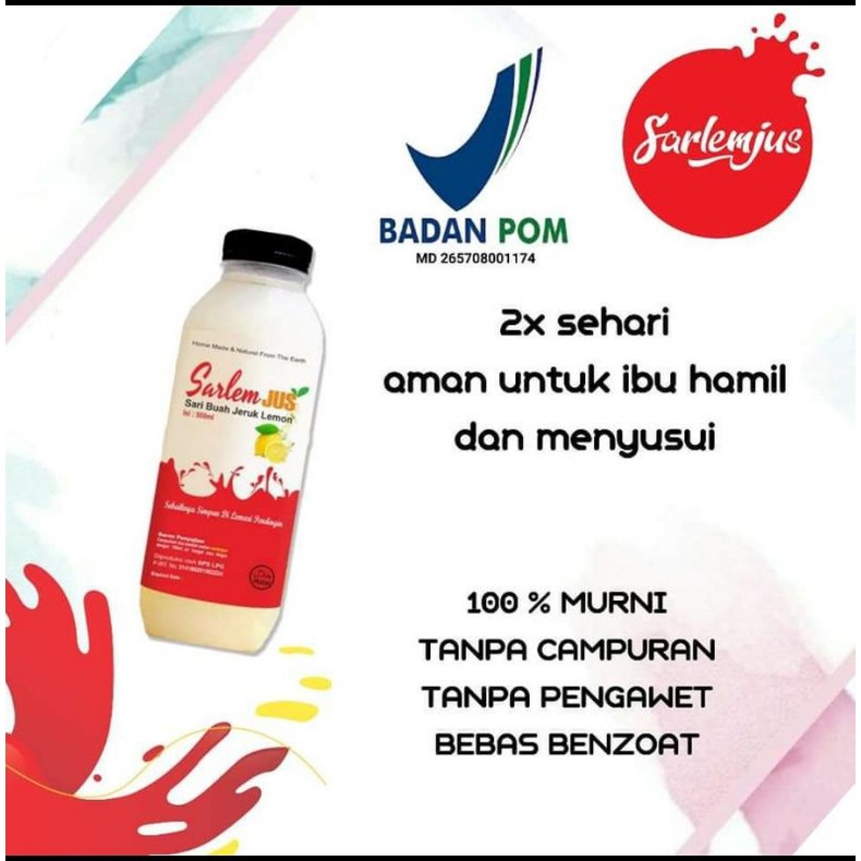 SARLEMJUS adalah sari dari buah lemon murni yang buah jeruknya kami petik langsung dari perkebunan kami, proses produksi kami langsung di perkebunan. Sehingga kami menjamin kualitas bahan baku jeruk kami benar-benar segar/fresh (kami petik lalu kami ambil sarinya) setelah melalui proses 3x penyaringan dikemas dalam kemasan botol 500ml yang diambil sarinya dari 2kg jeruk lemon, lemon yang kami pasarkan murni 100% tanpa bahan campuran apapun sehingga aman dan banyak manfaat untuk dikonsumsi.