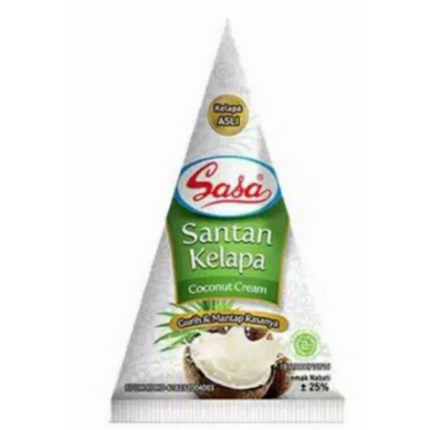 Sasa Santan Kelapa 65mlSasa Santan Kelapa 200ml - merupakan Santan berkualitas baik yang dihasilkan dari kelapa yang tidak terlalu tua karena rasa gurih kelapanya benar-benar terasa. Santan sendiri biasanya digunakan sebagai bumbu masakan atau bahan dasar pembuatan kolak atau makanan lainnya.Mendapatkan santan saat ini tidak lagi harus mengupas dan memarut kelapa, namun Sasa mengemas santan lebih modern dan lebih praktis digunakan dalam produknya Sasa Santan Kelapa 65ml. Sangat praktis dan meskipun dikemas modern, cita rasa dan aroma santan ini benar-benar kelapa asli. Sajikan hidangan nikmat dan gurih dengan cara cepat dan mudah bersama Sasa Santan Kelapa 65ml
