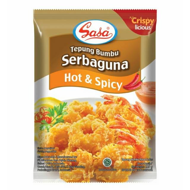 Sasa tepung bumbu serbaguna crispy licious hot & spicy, Tepung bumbu praktis cepat saji yang lezat rasa pedas.