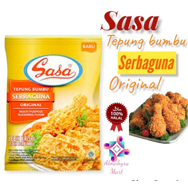 Tepung bumbu serbaguna original sasa adalah tepung bumbu praktis cepat saji yang lezat dan lengkap sehingga tidak perlu di tambah bumbu lain. KOMPOSISI : Tepung terigu, tepung tapioka, garam, penguat rasa mononatrium glutamat (MSG), rempah-rempah, pengembang natrium bikarbonat.