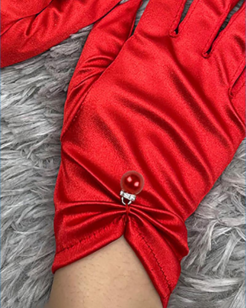 Satin Beaded Decor Ruched Gloves, Red