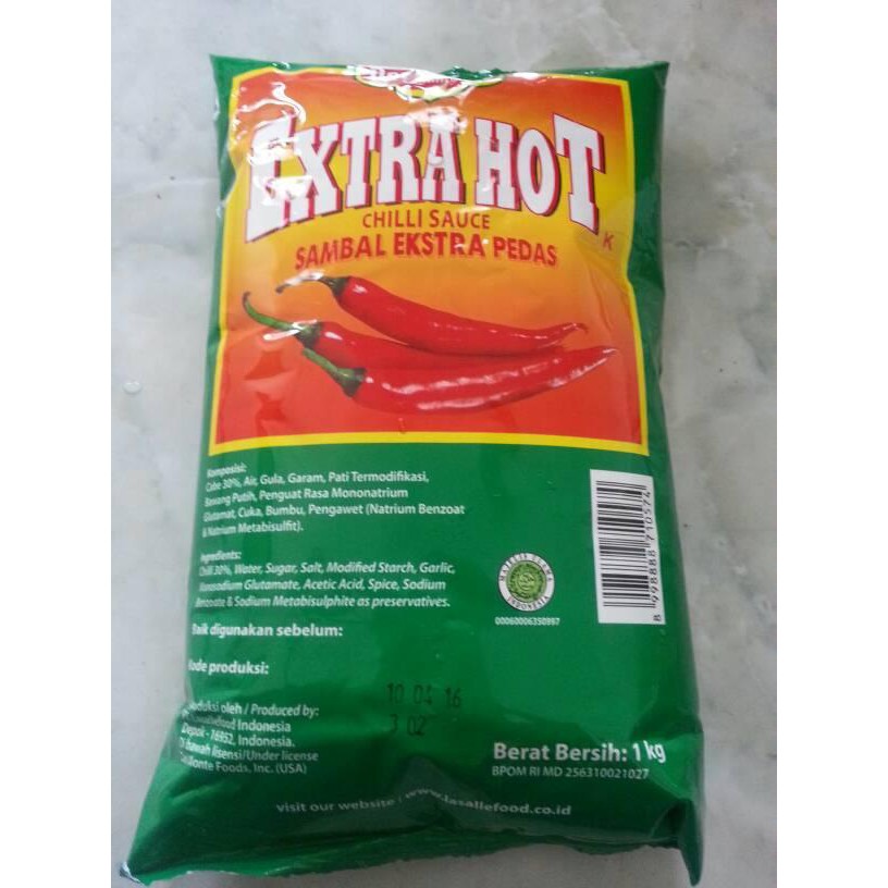 Description Saus Sambal Extra Pedas. Komposisi: Cabe, air, gula, garam, tepung, bawang putih, penguat rasa (mononatrium glutamate), pengawet (natrium benzoat & natrium metabisulfit), RI MD 0017