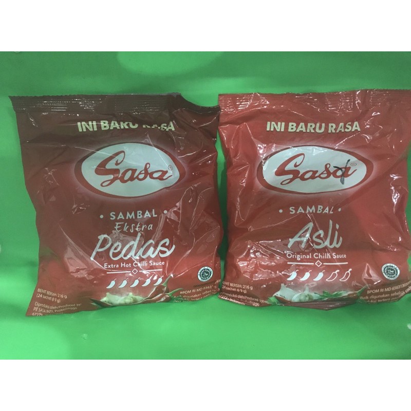 Saus Sasa ready varian sambal extra pedas dan sambal asli. Harga yang tercantum untuk pembelian perbpack isi 24 sashet netto @9 gram.