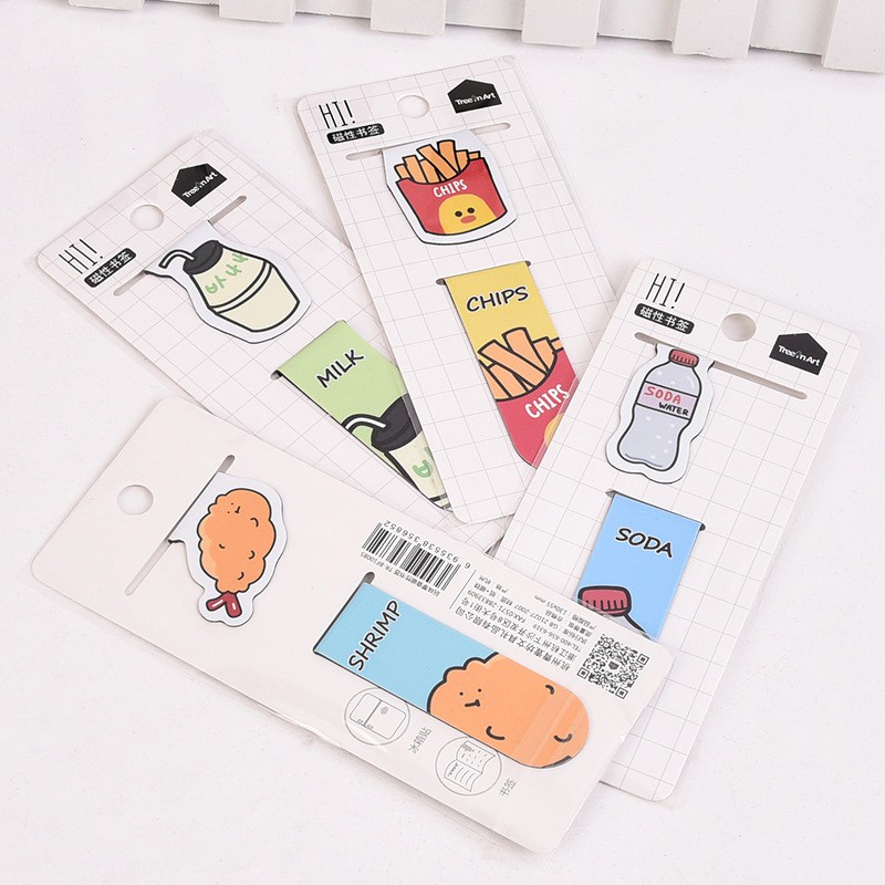Pembatas buku magnet bertemakan makanan dan minuman dengan warna-warna yang ceria. Mudah digunakan dan tidak merusak kertas. Tinggal jepit di lembaran kertas yang ingin ditandai. Tidak merusak halaman.