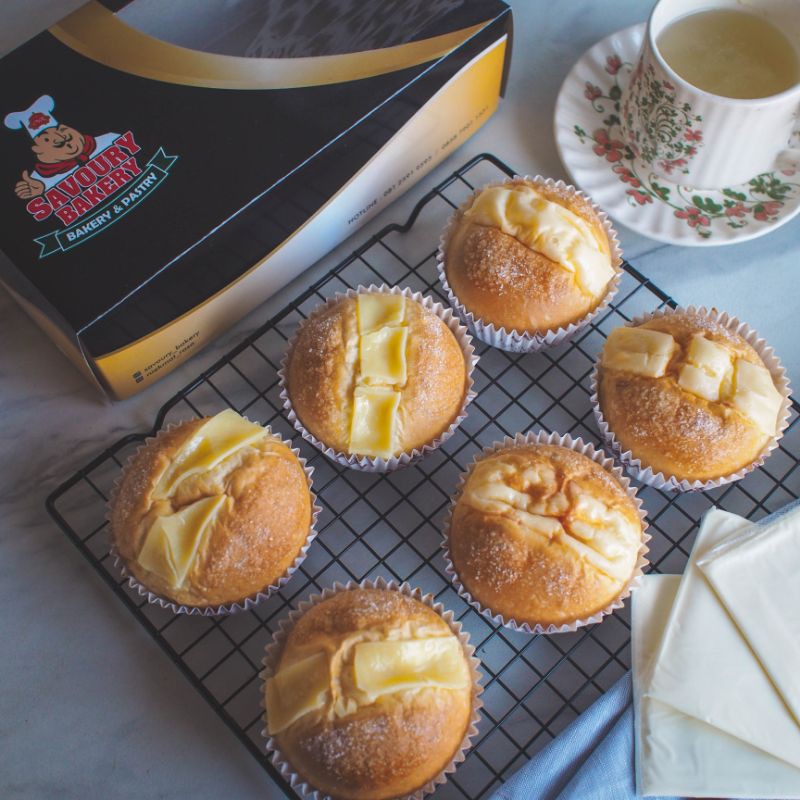 Roti manis dengan isian dan topping keju slice bertabur gula