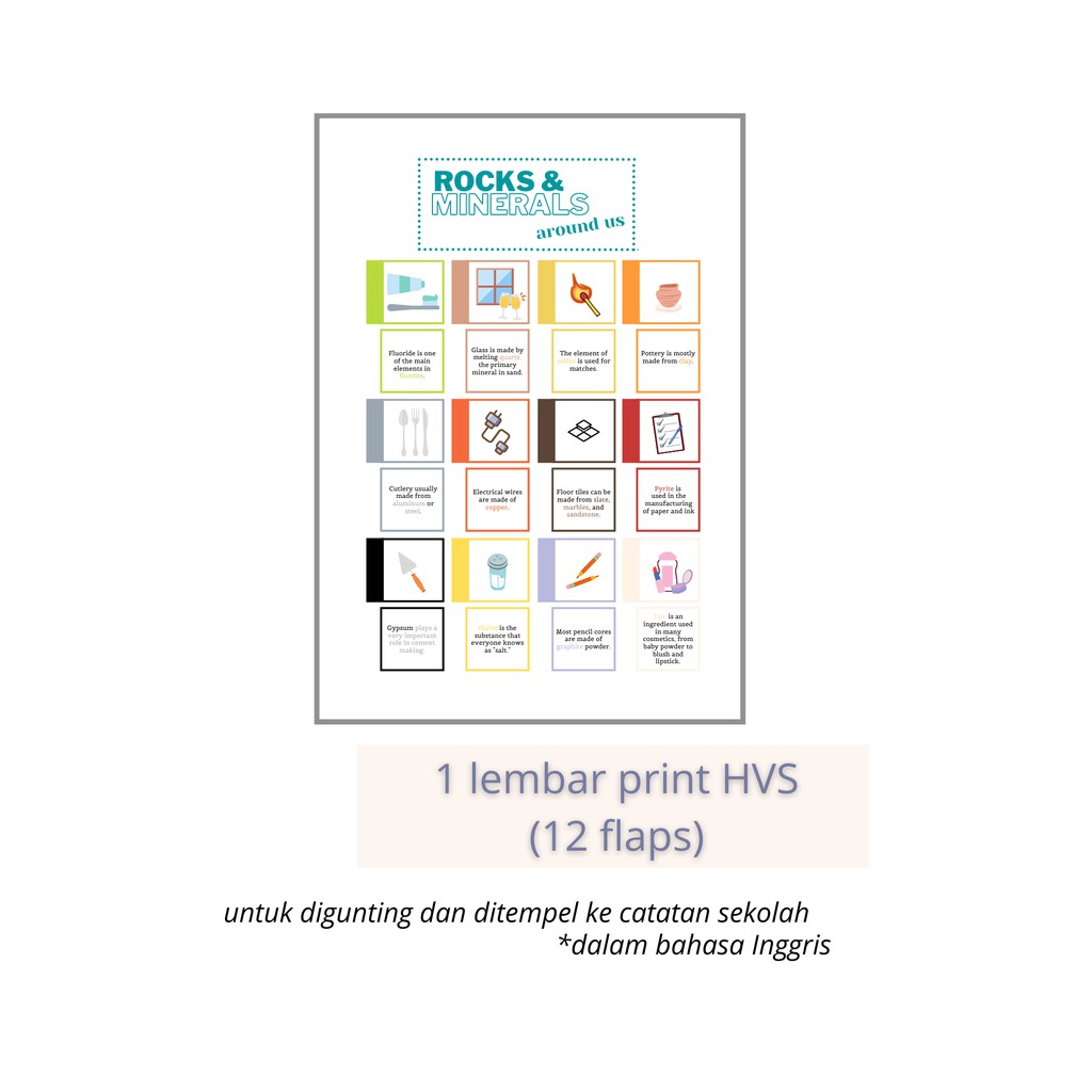 Dikirim dalam bentuk lembaran A4 yang belum digunting. Silakan ditempel ke binder/catatan sekolah kamu, supaya mereview bebatuan dan mineral bumi jadi lebih menyenangkan.