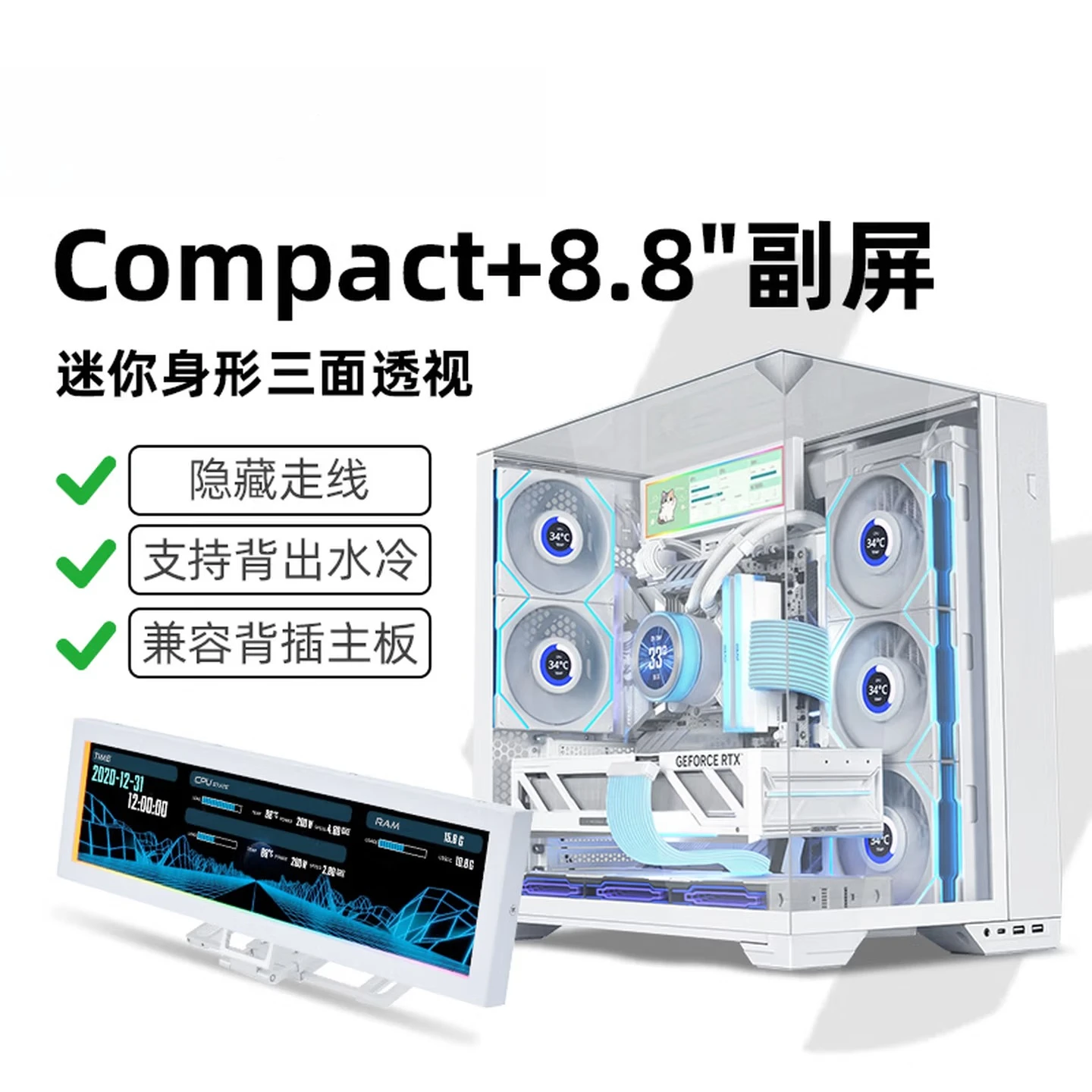 Sea View Room Desktop Computer Case, Three-Sided Glass/Medium Tower Chassis Vision Compact White + 8.8 Secondary Screen