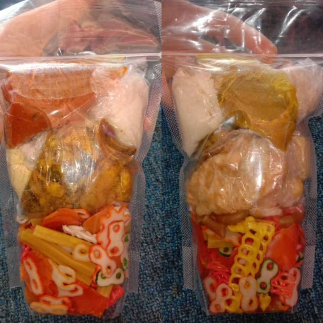 Isinya tulang, kerupuk oren, kerupuk bintang, kerupuk tangga, kerupuk sebring, kerupuk angka 8, kerupuk potato, kerupuk gelung, makroni, cuanki, cuanki tahu segitu banyaknya cuma 10k aja gaes yo diorder, bumbu cikur, cabe, penyedap rasa+gula. Udah komplit pokonya mah