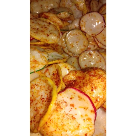 Cemilan seuhah lata-lata dengan bumbu kering khas Tasikmalaya, yaitu atom bulan dan aida.
