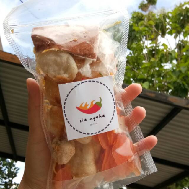 Terdiri dari mie kuning, kerupuk seblak, siomay tuyul, batagor mini, batagor lidar, bumbu pelengkap dan cabe tabur yg pedas nya nendang