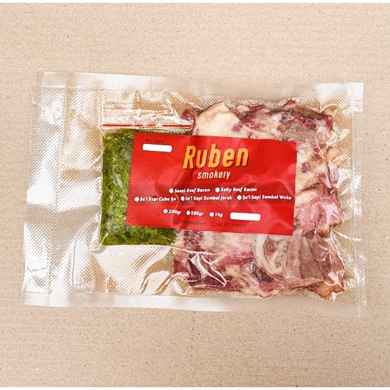 Sei sapi kami terbuat dari daging sapi pilihan dan sudah dibumbui, yang telah melewati proses pengasapan sehingga menciptakan aroma yang menggugah selera. Sei sapi RubenSmokery disajikan dengan 3 varian sambal yaitu sambal ijo, sambal jeruk, & sambal woku. Sei sapi merupakan teman yang pass saat dimakan dengan nasi hangat.