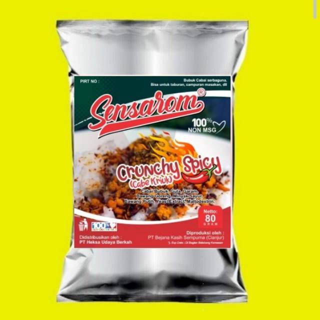 Sensarom Cabe Kriuk merupakan bumbu instant Non MSG yang terbuat dari bubuk cabe asli dan bumbu-bumbu alami lainnya. Diolah dengan proses higienis dan dibungkus dengan kemasan yang praktis.