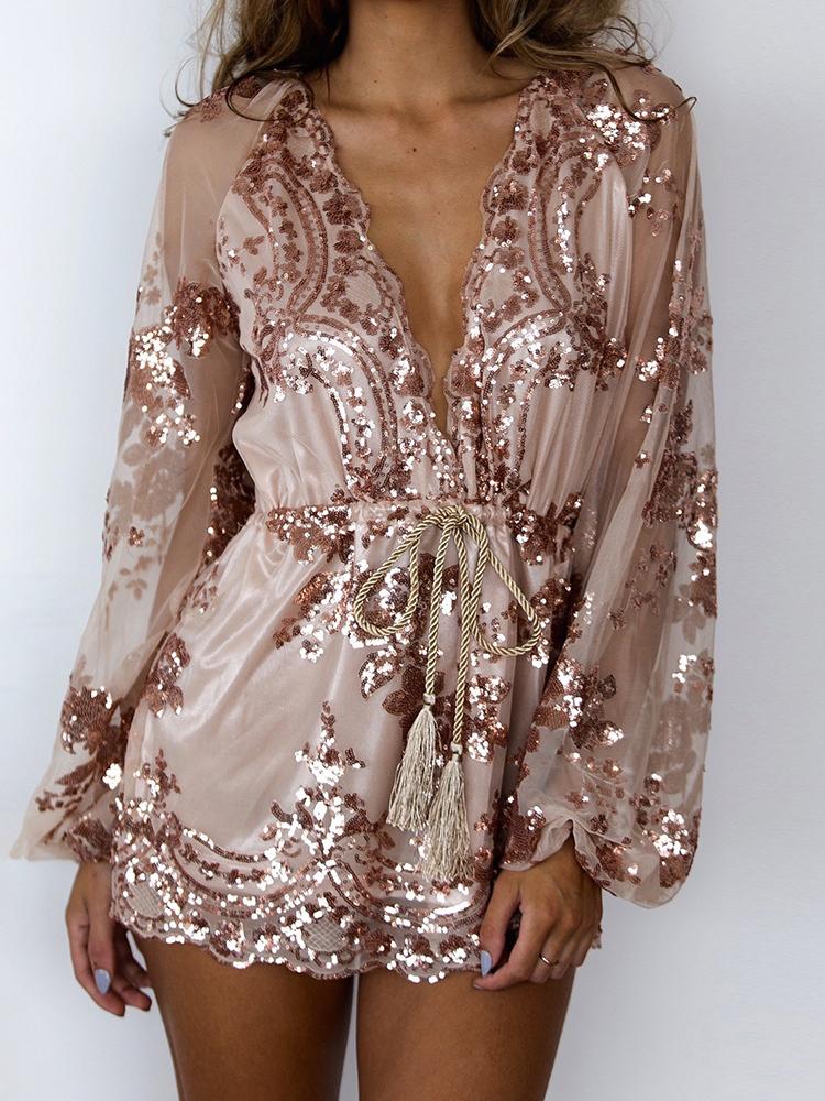 Sequins Deep V Drawstring Romper
