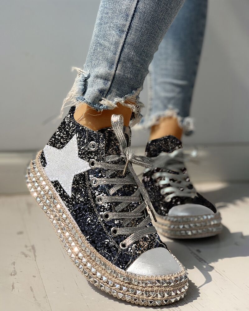 Sequins Rivet Embellished Lace-Up Sneakers