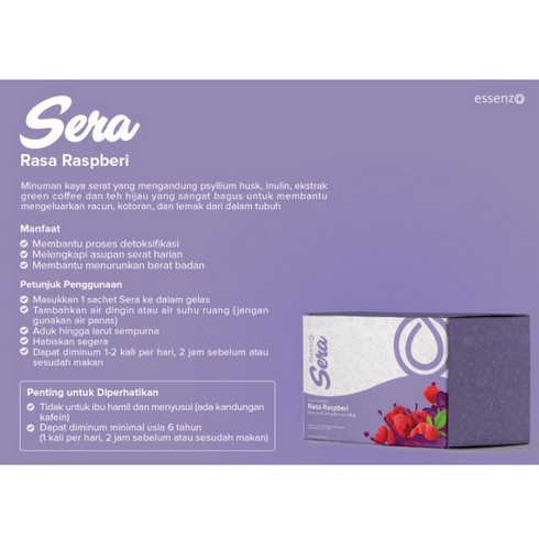 Essenzo Sera merupakan minuman kaya serat yang mengandung psyllium husk, inulin, ekstrak green coffee dan teh hijau yang sangat bagus untuk bantu mengeluarkan racun, kotoran, dan lemak dari dalam tubuh.