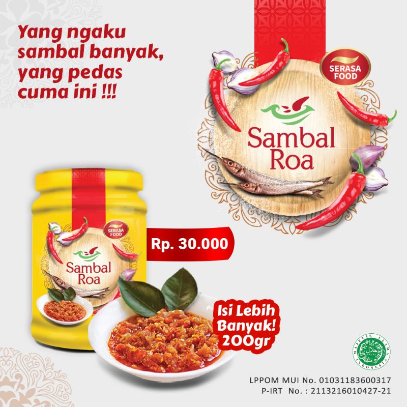 Serasa - Sambal Roa Serasa Sambal Roa adalah sambal yang dibuat dari ikan roa segar dan cabai rawit pilihan serta bahan pilihan lainnya. Dibuat dengan teknologi modern, rasa sambelnya lebih enak, isi lebih banyak, masa simpan lebih lama dan harganya ekonomis. Komposisi : Ikan Roa segar, cabai rawit, bawang merah, bawang putih, jahe, serai, minyak nabati, gula, garam, dll. Berat : 200 gr Masa Expired : 6 Bulan Harga : Rp 30.000 LPPOM MUI No. 01031183600317 P-IRT No. 2113216010427-21