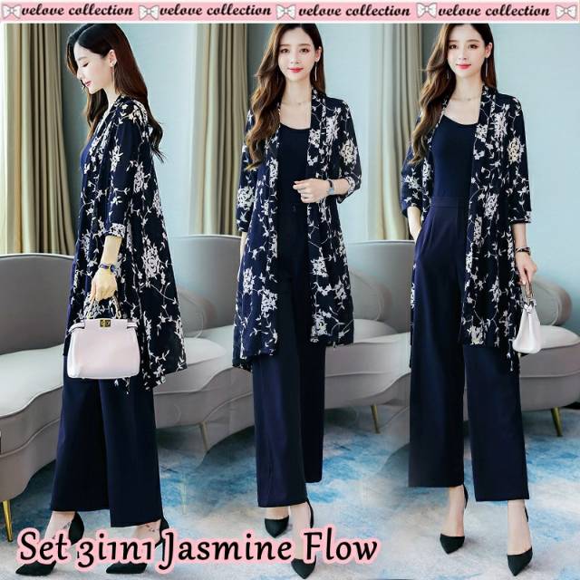 A5 Set 3in1 jasmine flow Navy matt wafer cardi print digital pj80cm bust no limit + pants kulot pj 92cm ada saku kanan kiri blkg ada karet+ free tanktop