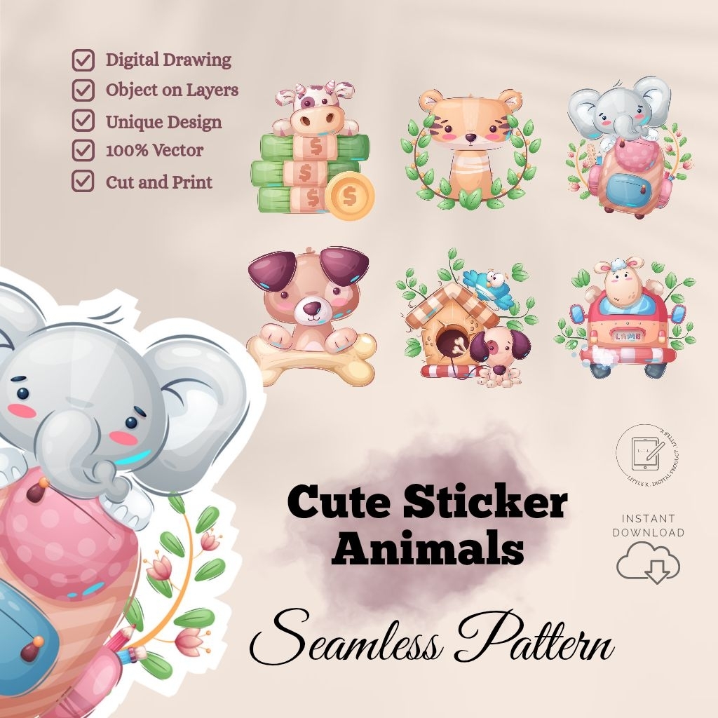 Set Cute Sticker Animals - Seamless Pattern - Clipart Digit