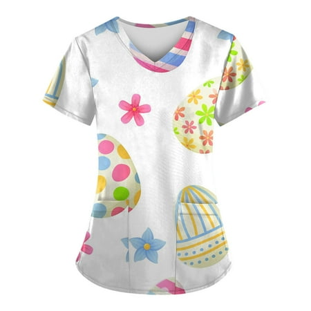 Women Scrub Tops Casual Bunny Printed Short Sleeve Holiday Classic Working Uniform Nurses Clothing V-Neck Holiday Cartoon Tshirts Blouse Tops With Pockets Leisure Dailywear
