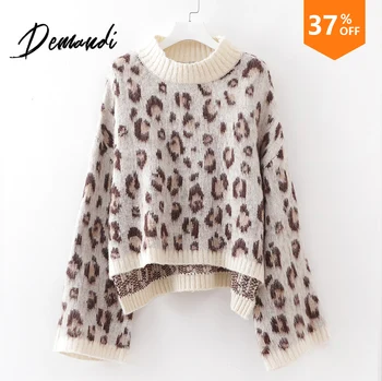 DEMANDI Sweaters Women's Pullovers Sexy Fall 2019 New Women's Long-sleeved Loose Leopard-print Sweaters with Round-collar Horns