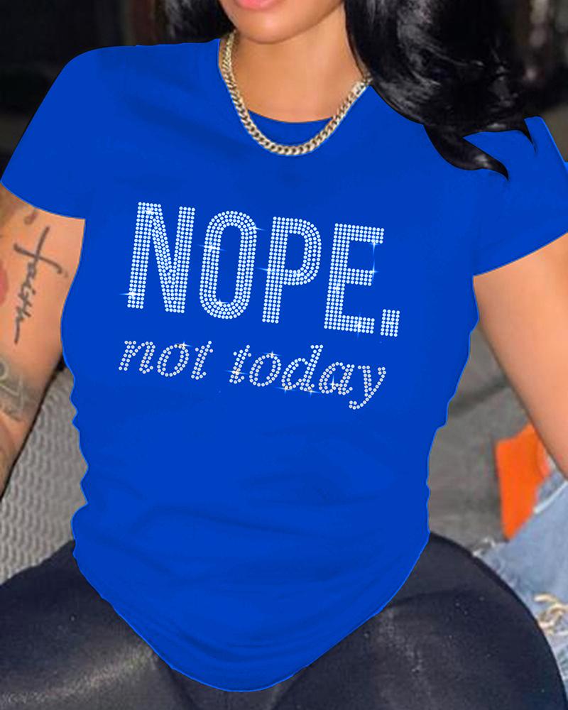 Short Sleeve Rhinestone Letter Pattern T-shirt, Blue