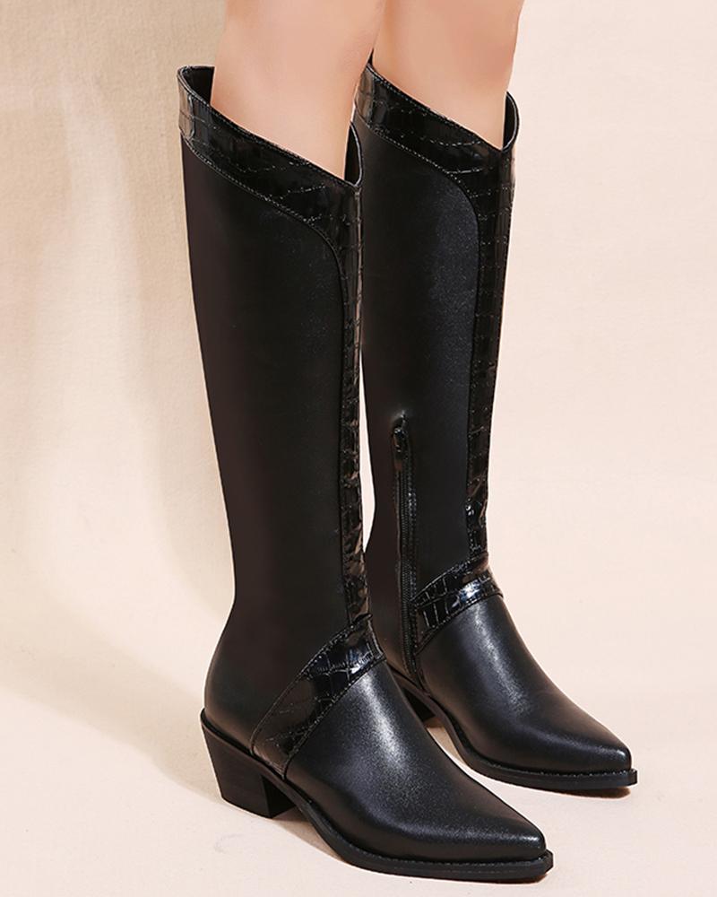 Side Zip Chunky Heel Riding Boots, Black