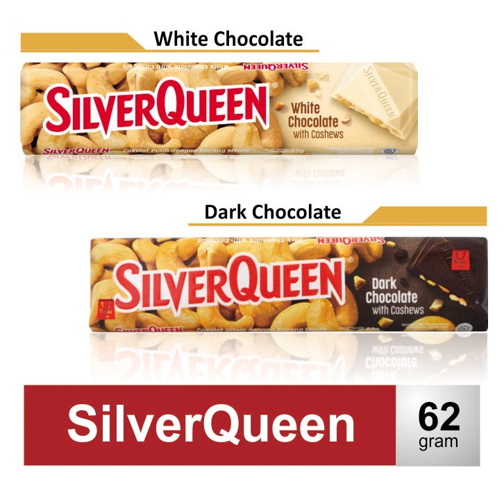 Silverqueen White Chocolate & Dark Chocolate merupakan perpaduan cokelat putih, susu, dan kacang mede di dalamnya.