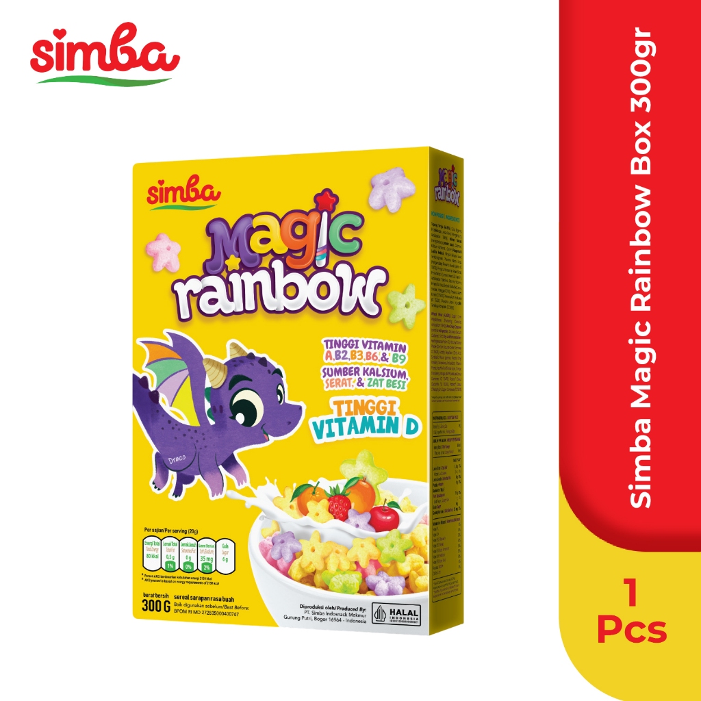 Simba Magic Rainbow Sereal Rasa Buah 300gr adalah pilihan sarapan menyenangkan yang penuh warna dan nutrisi. Sereal ini hadir dalam bentuk bintang warna-warni yang menarik, dengan rasa buah yang segar dan nikmat. Kaya akan vitamin A, B2, B3, B6, B9, serta tinggi vitamin D, Simba Magic Rainbow tak hanya memanjakan lidah tetapi juga mendukung kebutuhan nutrisi harian. Selain itu, sereal ini merupakan sumber kalsium, serat, dan zat besi untuk memulai hari dengan semangat dan energi penuh!