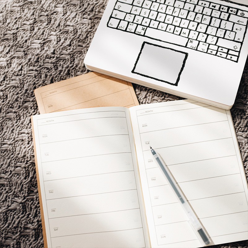 Buku perencanaan mingguan dengan sampul dan isi minimalis. Praktis dan mudah digunakan sehari-hari.