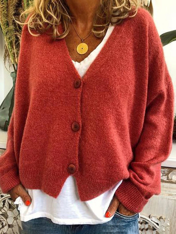 Simple Solid Color V-Neck Drop-Shoulder Sleeve Knit Cardigan