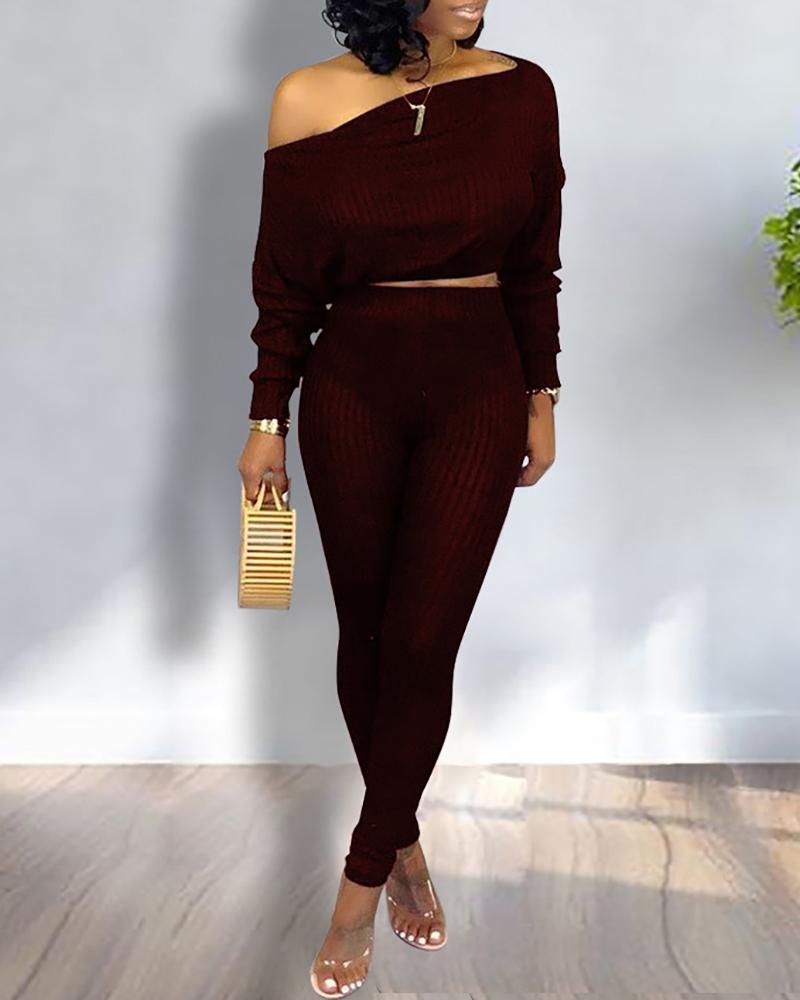 Skew Neck Ribbed Crop Top & Pants Sets, Wine red