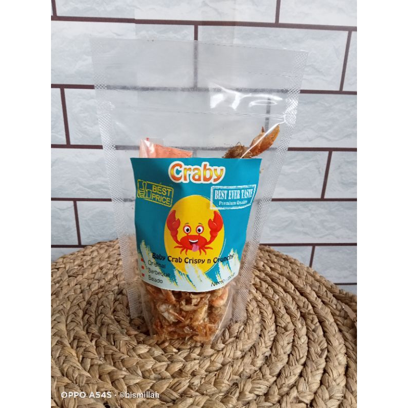 Snack atau Cemilan Baby Crab tinggi kalsium 100% original fresh food. Tersedia rasa Original, Barbeque, Balado. dengan Berat Netto 110gr.