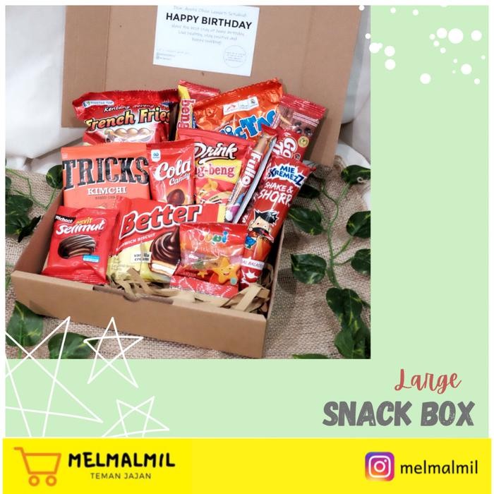 MOHON DIBACA DULU YA KAK Sistem Pre Order Box Ukuran 22x22x5 cm Isi 15 pcs snack (Random ya kak sesuai ketersediaan stok yang ada, bila kosong akan digantikan yang senilai) FREE Gift card (Bisa custom dituliskan di NOTE/CATATAN atau kami kirimkan random sesuai tema ULTAH/WISUDA/EVENT APAPUN) FREE BUBBLE WRAP (Pengiriman ke luar kota) Nama pengirim mohon dicantumkan di kolom DROPSHIPPER HAPPY SHOPPING #temanmelmalmil