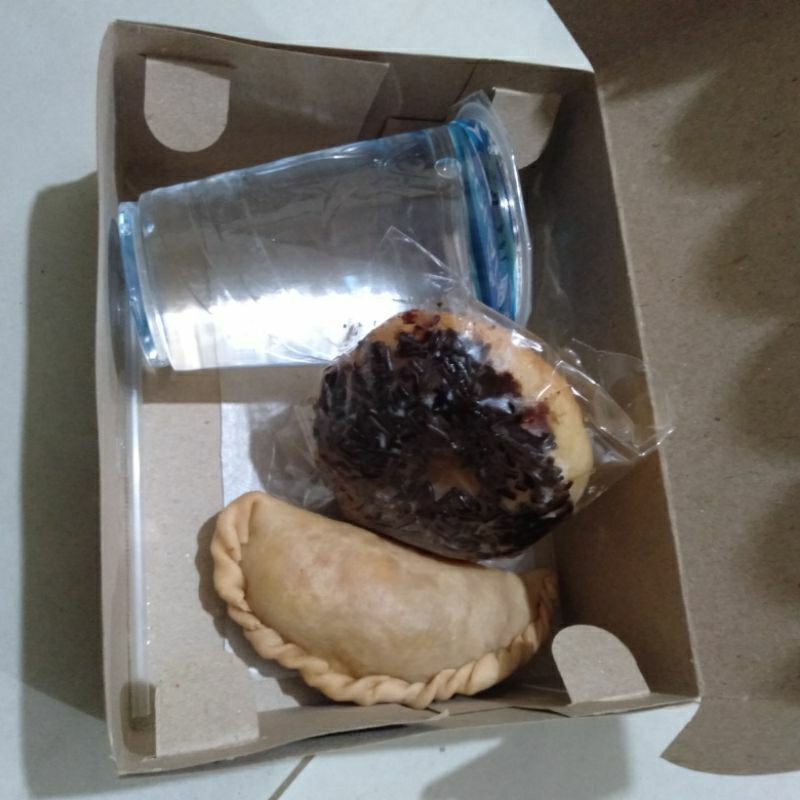 Snack box, isi 1 pcs donat coklat / keju , 1 pcs pastel isi ayam, dan 1 pcs minuman gelas.