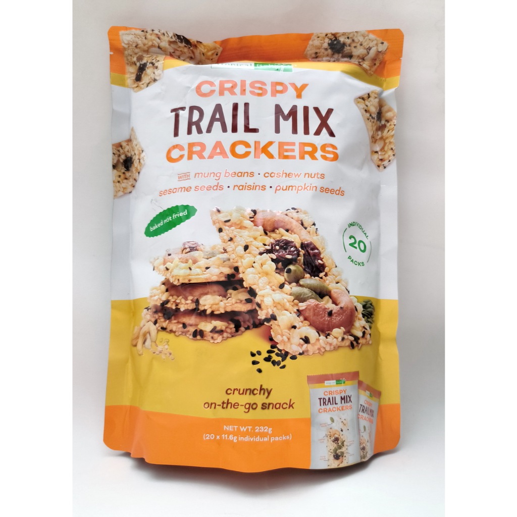 - Our Trail Mix Crackers are baked not fried with 20 perfectly portioned packs inside, Topped with sesame, cashew, pumpkin and mung. A cracker that's simply yum on the tongue. Plus there's sweet little raisins to satisfy your cravings. with mung beans, cashew nuts, raisins, sesame seeds, pumpkin seeds60 calories per 1 - pack All Natural Vegan Friendly No GMO No Added MSG No Artificial colours, flavours or preservatives Good source of dietary fibre 232g