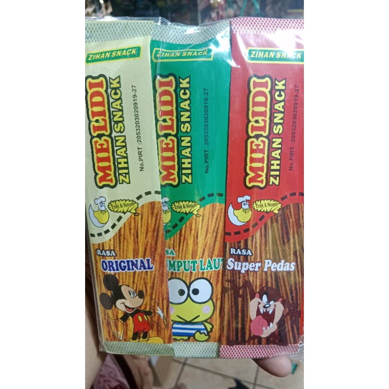 Snack Mie lidi dengan berbagai rasa didalamnya (ori, pedas,bbq, rumput laut, balado, jagung bakar) . 1 pack isi 12 pcs..