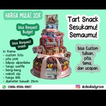 Snack disusun seperti kue tart. Bisa dibuat sesuai pesanan, baik budget harga maupun snacknya.