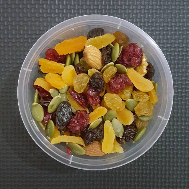Isi walnut, almond, kismis, cranberry, apricot, golden kismis, pumpkin seeds.