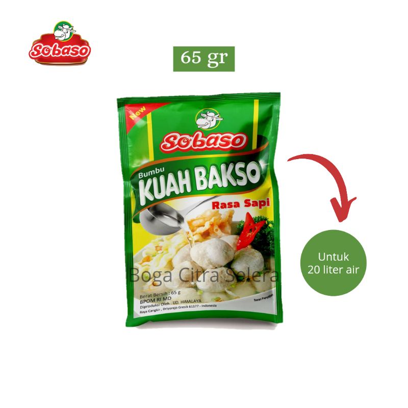 Bumbu Kuah Bakso Rasa Sapi 65 gram Sobaso, cukup diseduh dengan air panas, mampu menghadirkan kuah bakso dengan rasa khas tulang sapi dengan berbagai rempah–rempah seperti pala, cengkeh, bawang merah, bawang putih dan daun seledri.