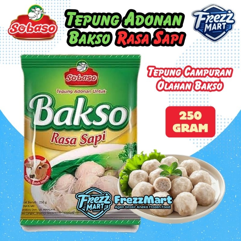 Tepung adonan untuk bakso rasa sapi "Sobaso" hadir untuk membantu agar aroma khas bakso dan tekstur empuk, kenyal, dan juicy di bakso tetap dapat di pertahankan premiks ini di perkaya dengan bumbu ekstrak daging sapi.