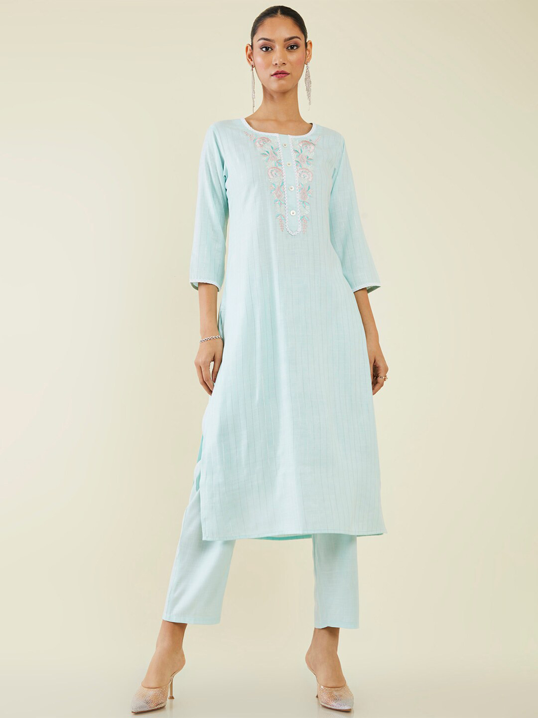 Soch Striped Thread Work Straight Regular Kurta with Trousers, Blue