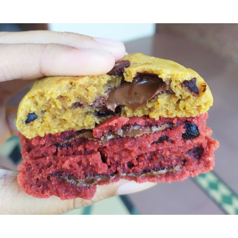 Soft Baked Cookies varian rasa Red Velvet dengan isian dark coklat yang lumer.