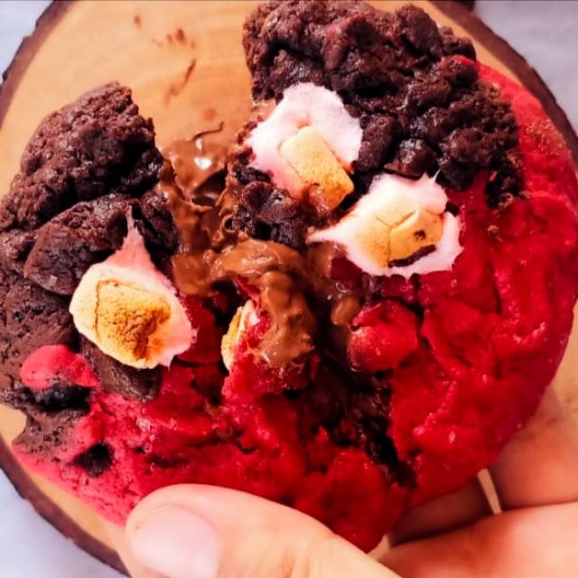 Soft baked cookies dengan rasa yg unik Perpaduan dr rasa Red velvet dan coklat menyatu dengan melted nya nutella yang melimpah,, membuat cita rasa yg mewah dr setiap gigitan nya,,,