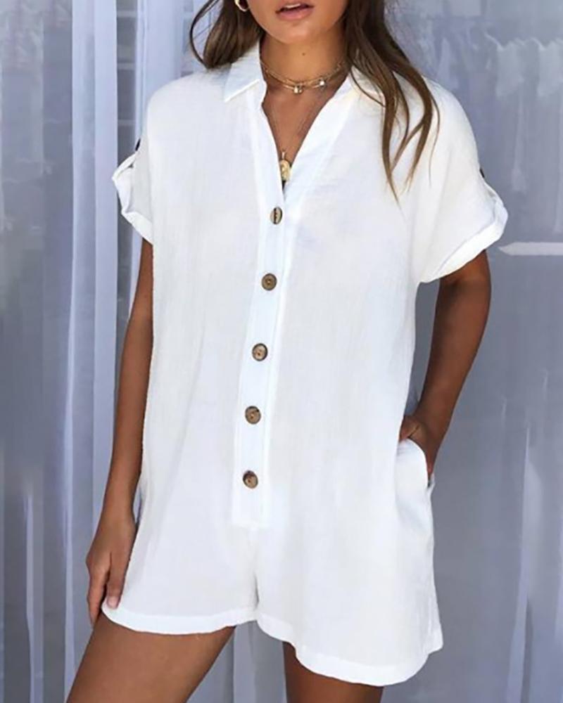 Solid Button Design Short Sleeve Romper, White